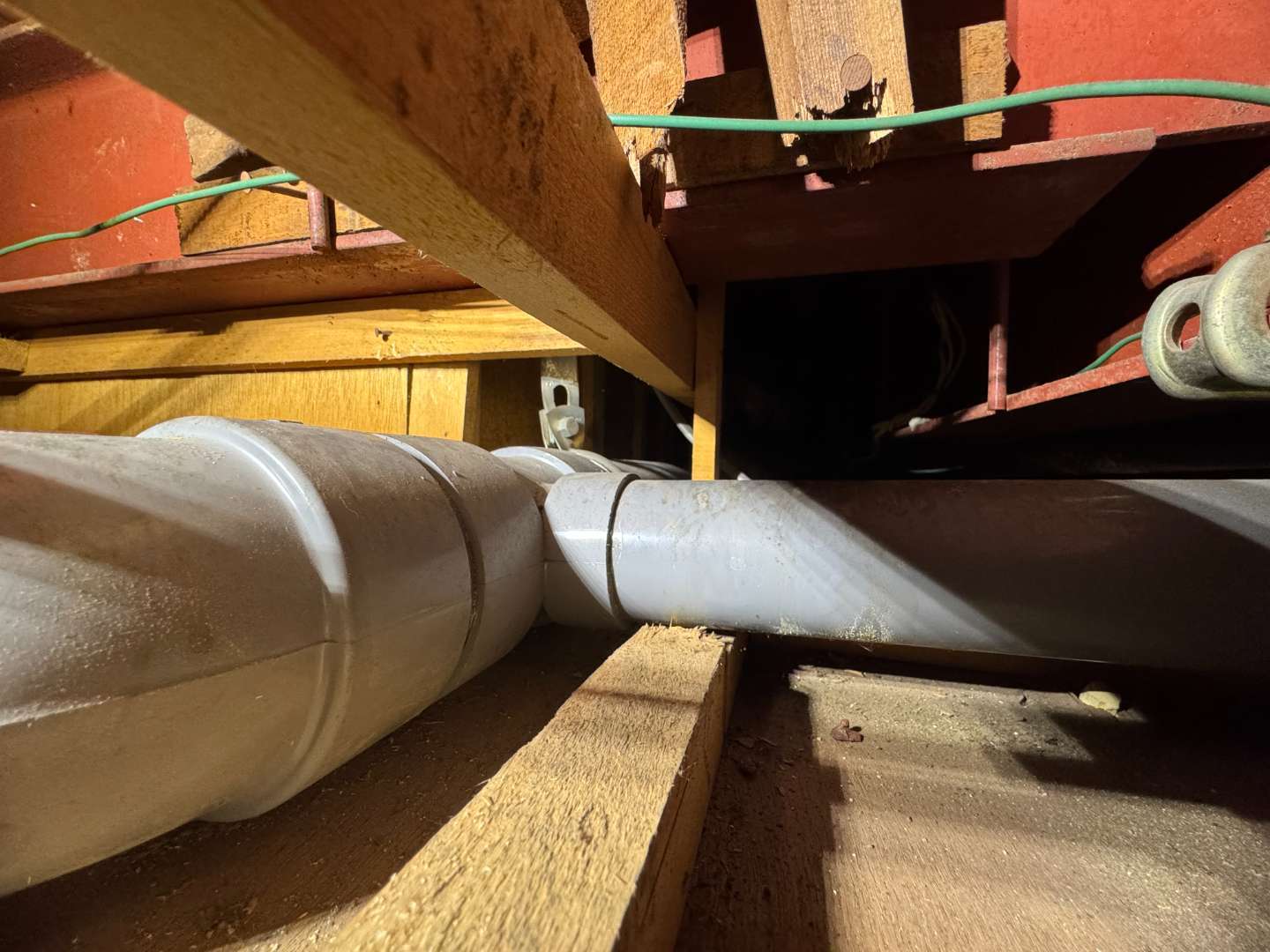 詳細: 3階の浴室や洗面台から流される「お湯」が、排水管(VU75およびVU100)内部を通る際、熱で配管が膨張します。この膨張した配管が、天井裏の「下地の木材」に直接接触している箇所があり、その摩擦や押し付けによって「パキッ」という異音が発生していたのです。