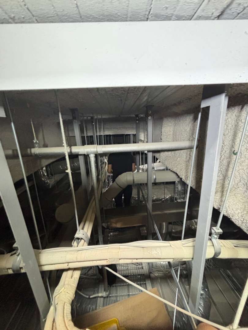 1.支持金物の増設(重さの分散): 既存の吊りバンドの間隔が広すぎたため、支持金物を新たに追加。配管の荷重を分散させ、一箇所にかかる負担を減らしました。
