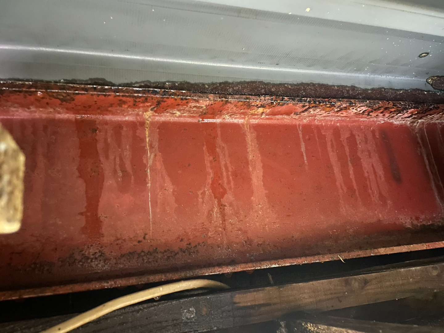 キッチリ防食処理のされていない銅管は電蝕でピンホールが空き、少しづつ腐食範囲がひろがります。今回の建物は築45年だったので銅管が怪しいなと…。