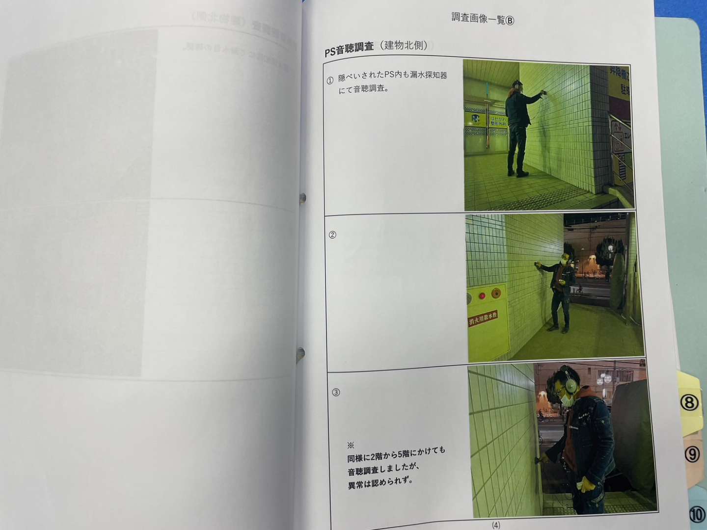 系統確認調査をしている状況を時系列順に写真と時間帯がわかるようにします。そして調査開始から終了までの状況を細かく明記し、修繕・復旧の資料にも役立たせます。
