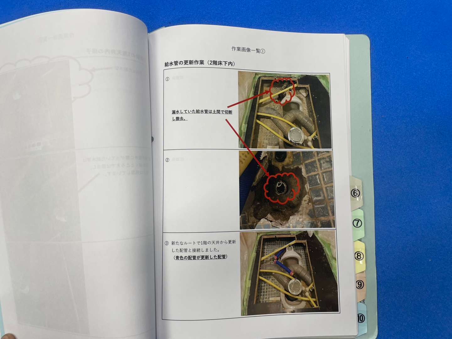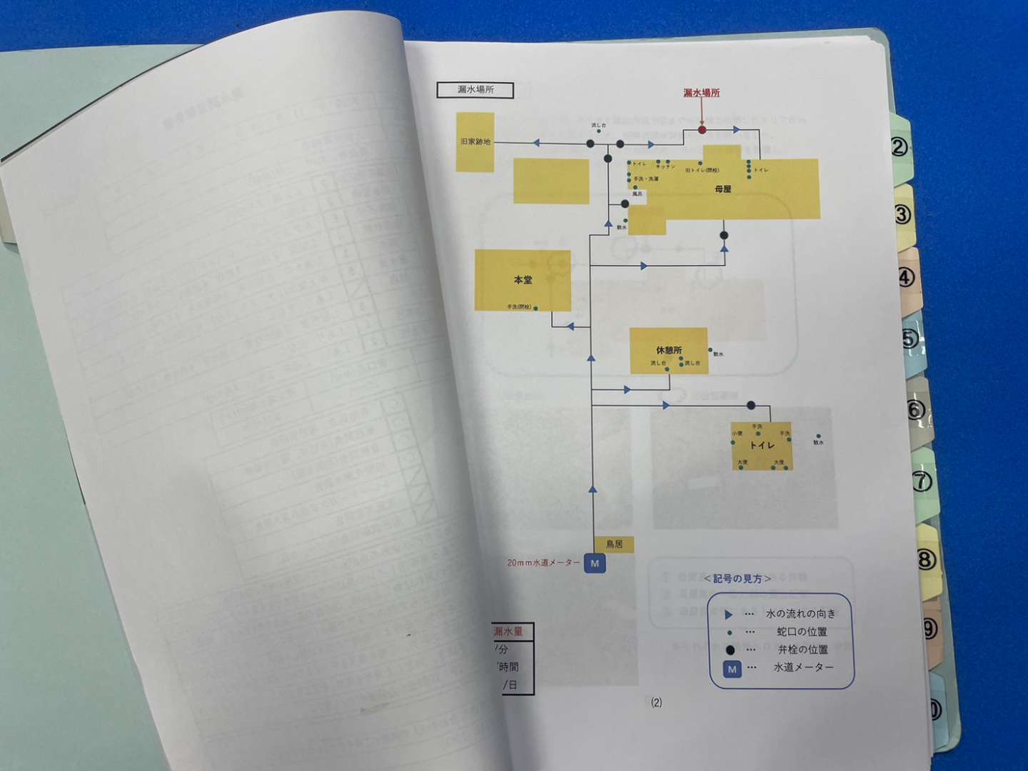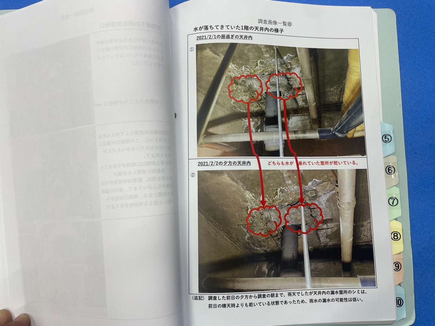 例えば「水道メーターが1分間で4ℓの漏水が発生している」や「地下の天井から水がポタポタと落ちてきている」などの状況を写真・動画で残します。