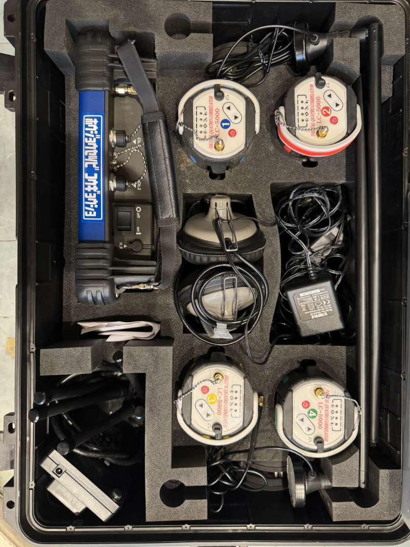 調査の要となるのが、高性能な【ロガー(記録装置)】です。僕たちは、敷地内の広い範囲で、漏水している可能性のある配管上の仕切り弁や水栓など、配管と直接つながる箇所に2つのロガーを設置します。(1つのセットでは4台まで設置可能)