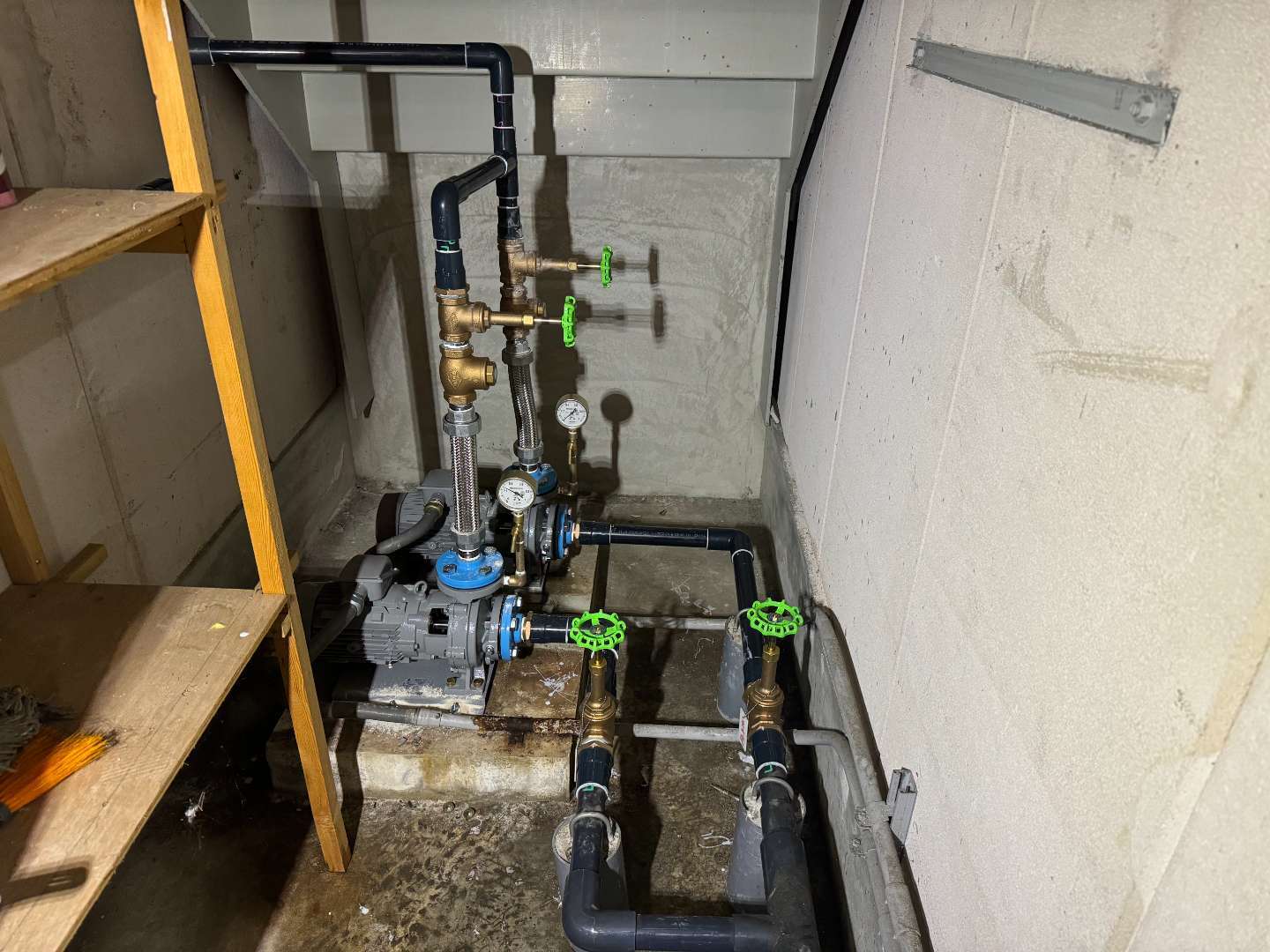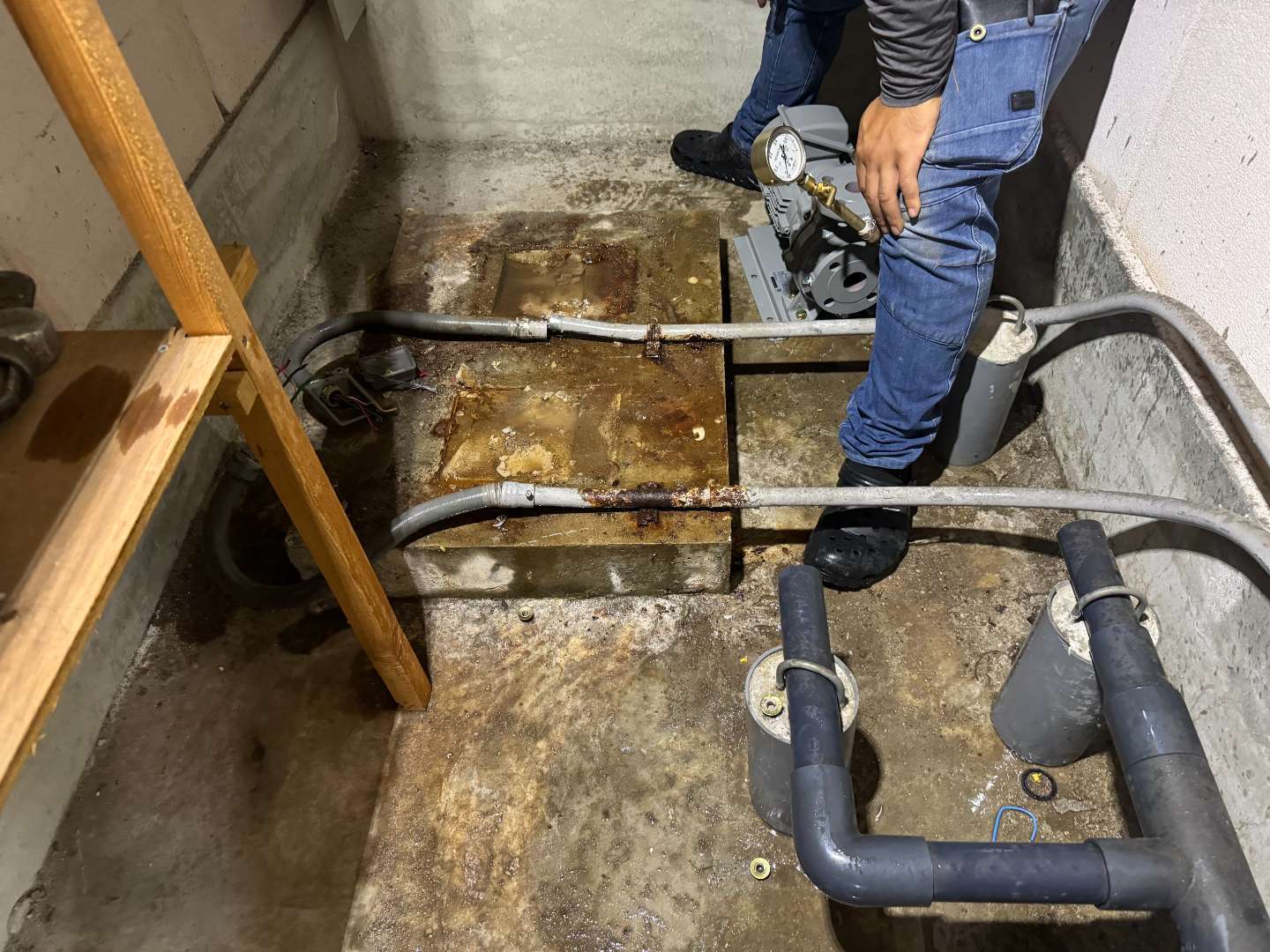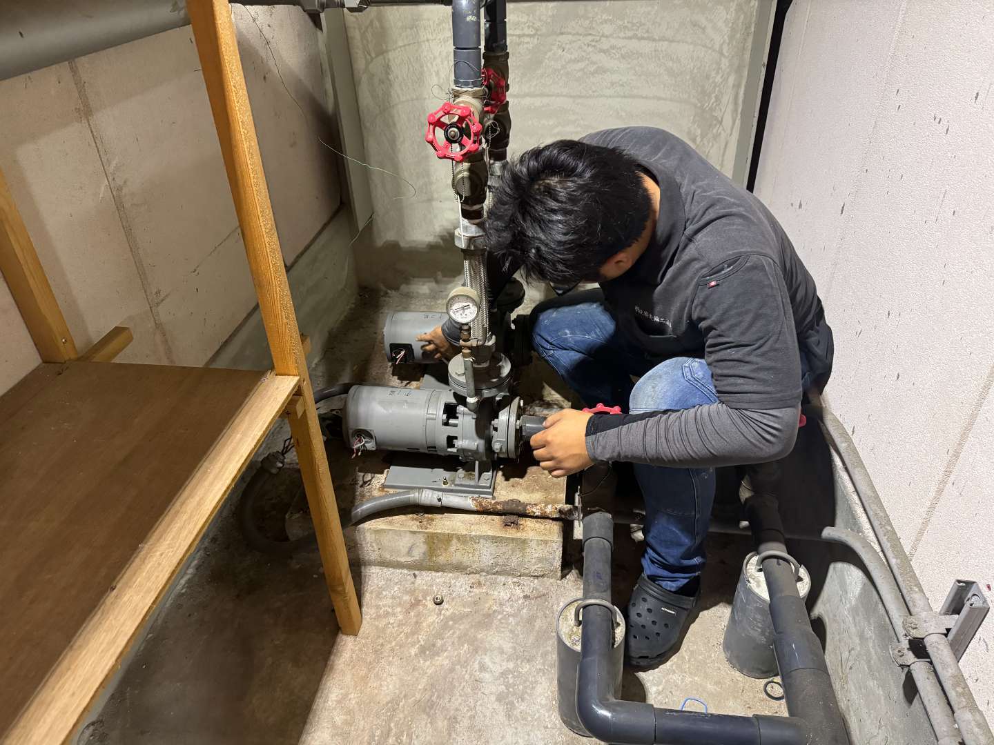 入居者様の不便を最小限にするため、私たちは直ちに夜間緊急対応を開始。揚水ポンプの交換には時間がかかるため、水道メーター直結の緊急用水栓から長いホースを使い、1階から屋上の高架水槽まで水道水を「直圧で」無理矢理送り込む応急処置を実施。徹夜作業でその夜の給水を確保しました。
