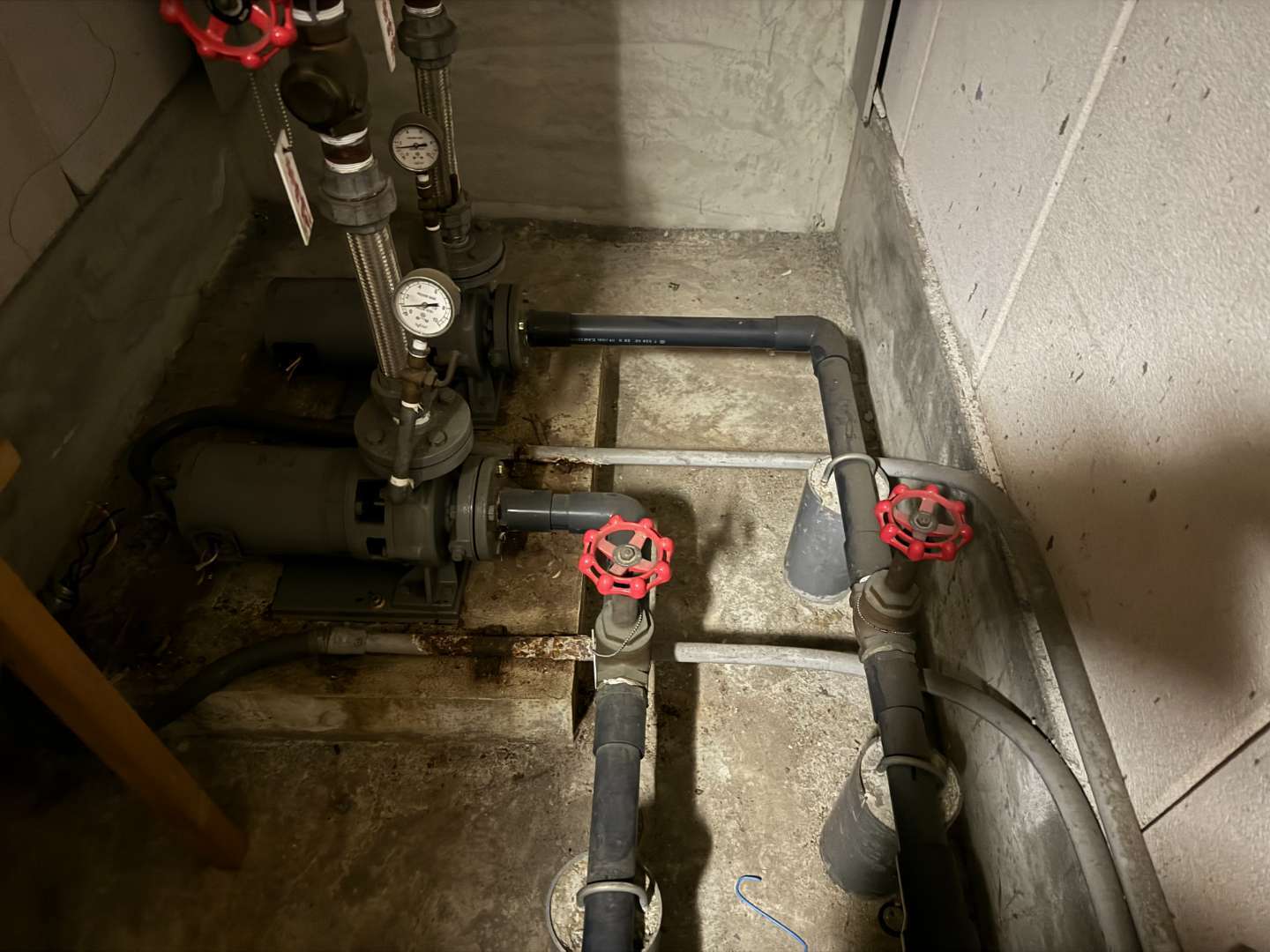 ある夜21時過ぎ、大阪府内の築40年のマンション(約50戸)から「全戸断水している」との緊急連絡が入りました。急行すると、1階の揚水ポンプが故障し、屋上の高架水槽が空っぽの状態。マンション全戸のライフラインが停止している深刻な状況でした。